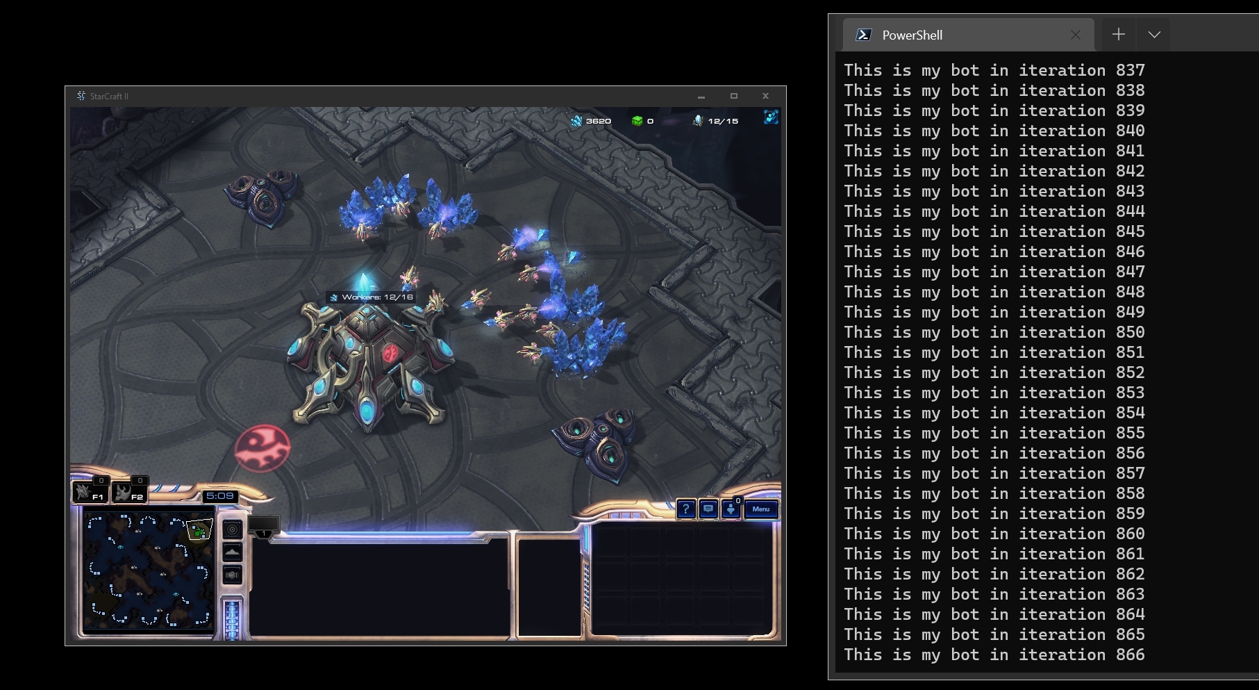 run_game( # run_game is a function that runs the game. maps.get("2000AtmospheresAIE"), # the map we are playing on [Bot(Race.Protoss, IncrediBot()), # runs our coded bot, protoss race, and we pass our bot object Computer(Race.Zerg, Difficulty.Hard)], # runs a pre-made computer agent, zerg race, with a hard difficulty. realtime=False, # When set to True, the agent is limited in how long each step can take to process. )