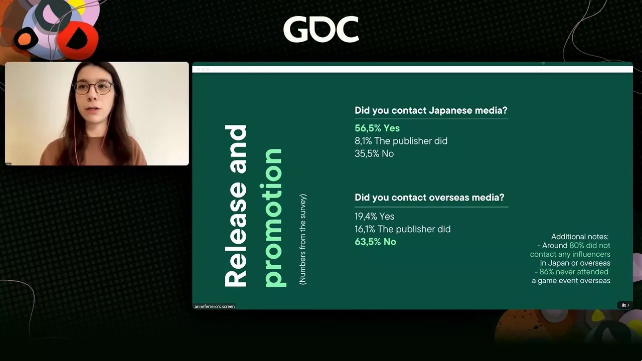 媒体联系方面,65% 左右的作品都会发新闻稿等相关资讯给日本国内媒体,但会联系海外媒体的比例则是反过来,主要原则还是不知道有哪些媒体、无法提供英文版新闻稿等语言隔阂因素。另外,大约 80 % 的开发者不会联系主动任何网红(不论国内外),只被动的希望网红们可以去玩他们的游戏。有 86% 开发者不曾将游戏带到海外参展,即使有,也是以邻近的中国台湾地区、韩国为主。