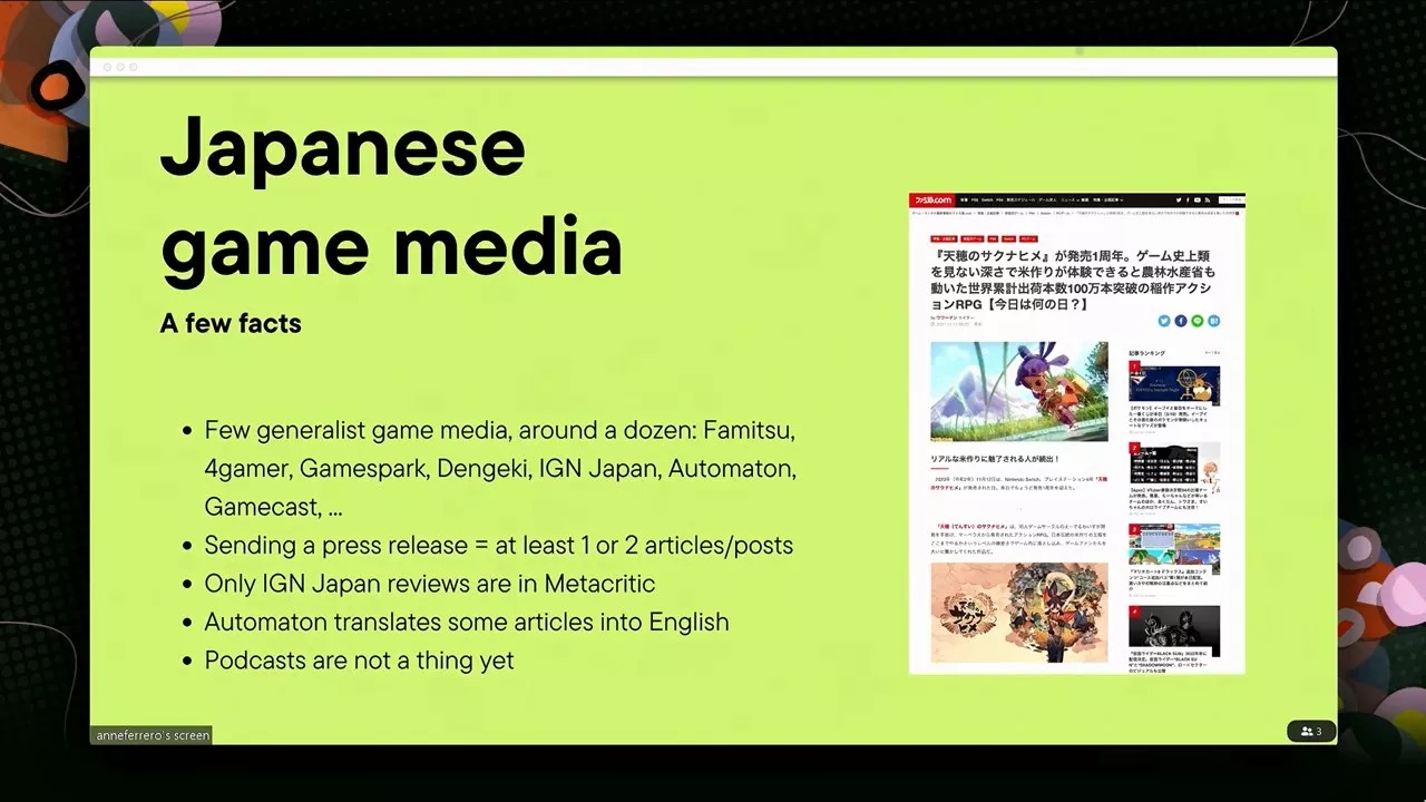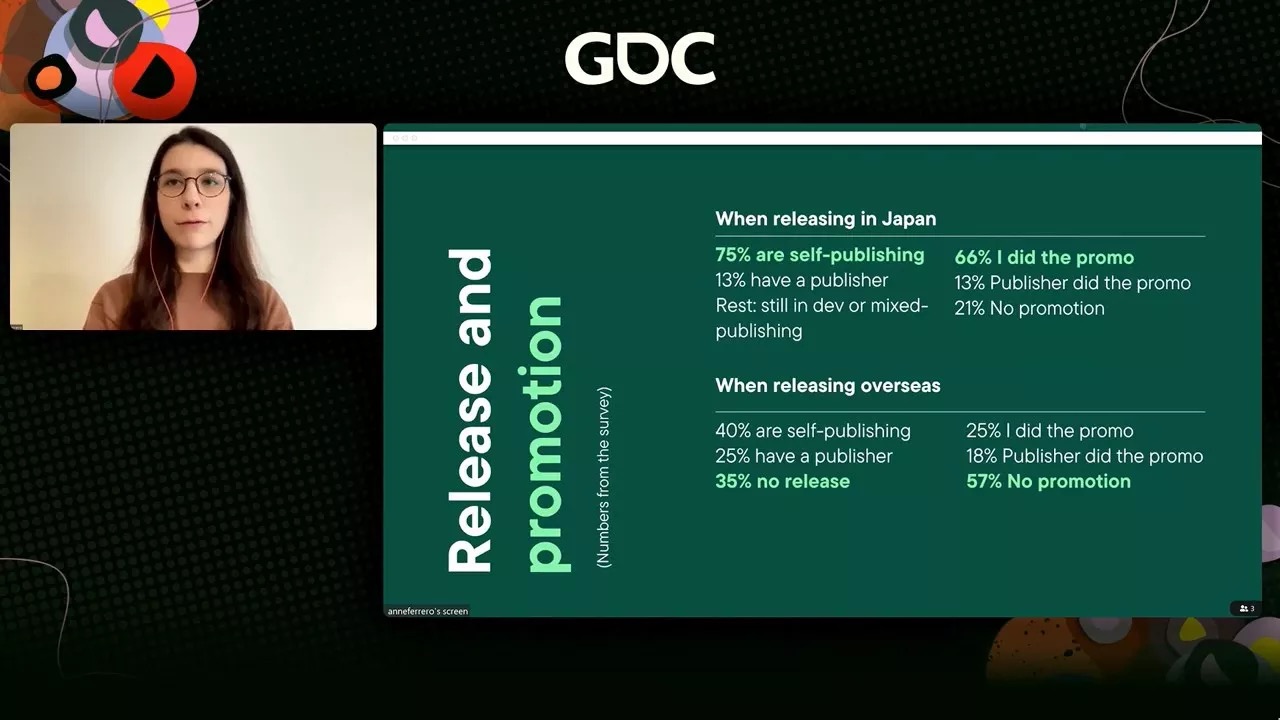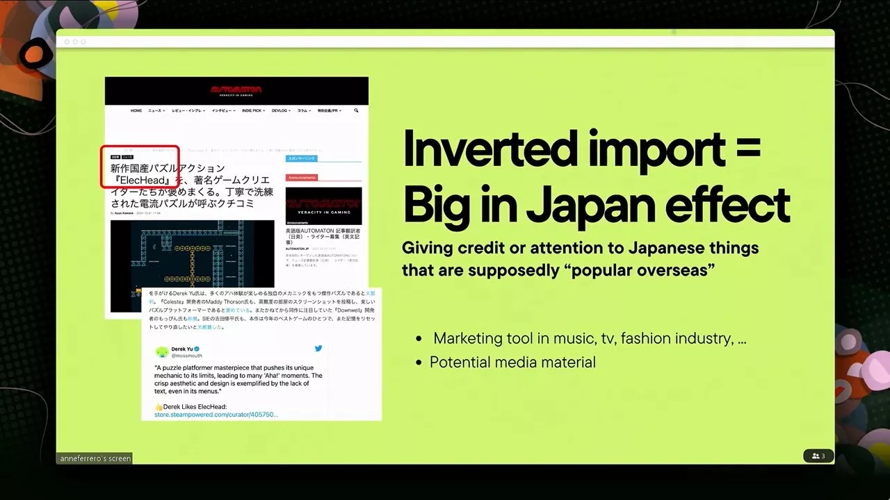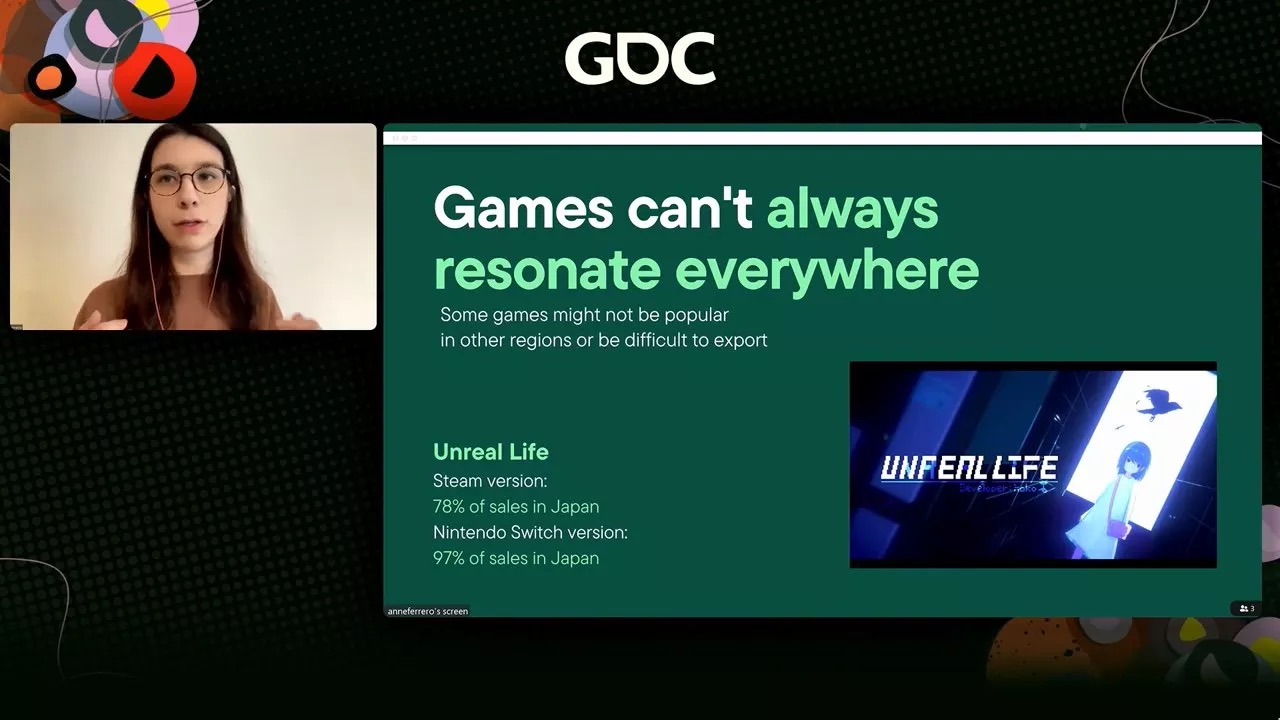 日本是电玩游戏产业代表性的大国,但日本的独立游戏,相较于全球,能见度与影响力就没那么强烈。在日本经营着独立游戏开发者社群的 Anne Ferrero,于 2022 年的 GDC,以《Big in Japan, Not in the West: The Difficults of Cross-Cultural Appeal》为题,分享了她收集与整理的日本独立游戏开发者概况,以及面向跨文化的全球市场时,所该注意的事项。