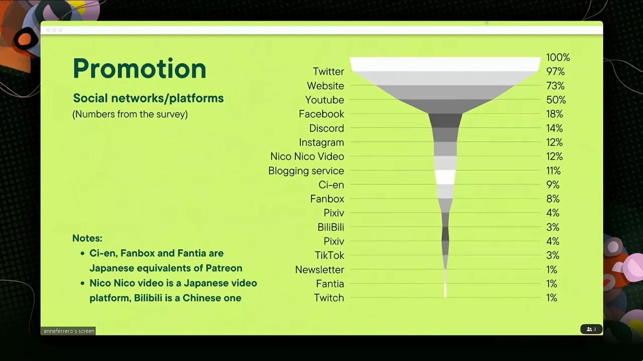 游戏宣传的管道,几乎全部的受访者都会透过 twitter 宣传,有七成以上会有网站页面,半数有做 Youtube 宣传影片,但剩余平台的使用比例就都不高,海外流行的 twitch 在日本的使用率是低到不行。