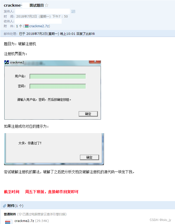 在面试官问完我之后,也允许我向TA提问。当时我说我曾经看过你们部门出版的一本游戏安全的书籍,我问TA有没有参与写作。TA似乎没听说过这本书,说可能是别的部门编写的,TA自己的部门没有参与。后来我就没问什么了。最后,TA给我布置了一道题,说一会给我发一封邮件,让我在周末之前完成邮件中的附件问题,应该也是想看看我实际的分析功力究竟怎样吧,之后便挂断了电话。