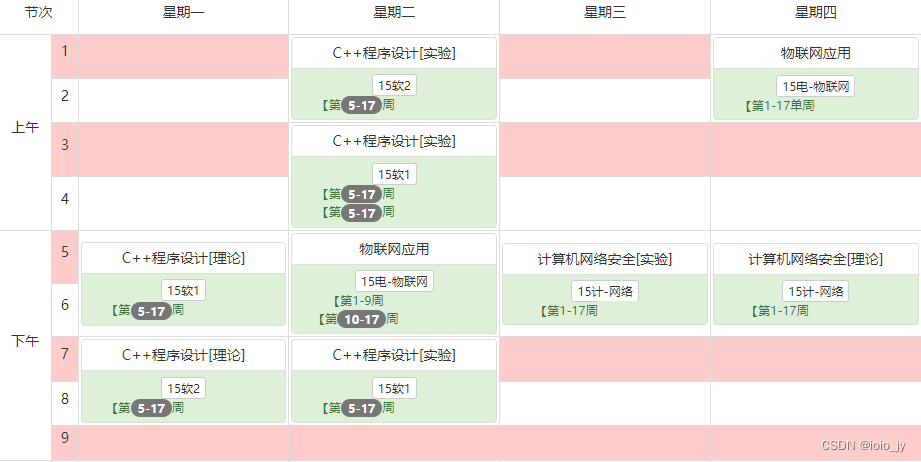 之前也提到过,我来到X高校任教之后,被安排的第一门课是《计算机网络安全》,估计也是由于院长知道我有这方面的底子,才点名让我上这门课的。说来也巧,这门课在我刚来的时候,是大三第二学期安全方向同学的专业课,于是就安排给我上了。但是后来有所调整,这门课被改到了大三的第一学期。因此很多时候我也是在感叹,假如我稍微来早点,或者来晚点,那么这门课也许就不是我教了,毕竟隔了一个学期才上这门课,也许领导就忘记我是安全出身,就照旧给过往的老师上了。这里我也把我任教的第一个学期的课表贴出来: