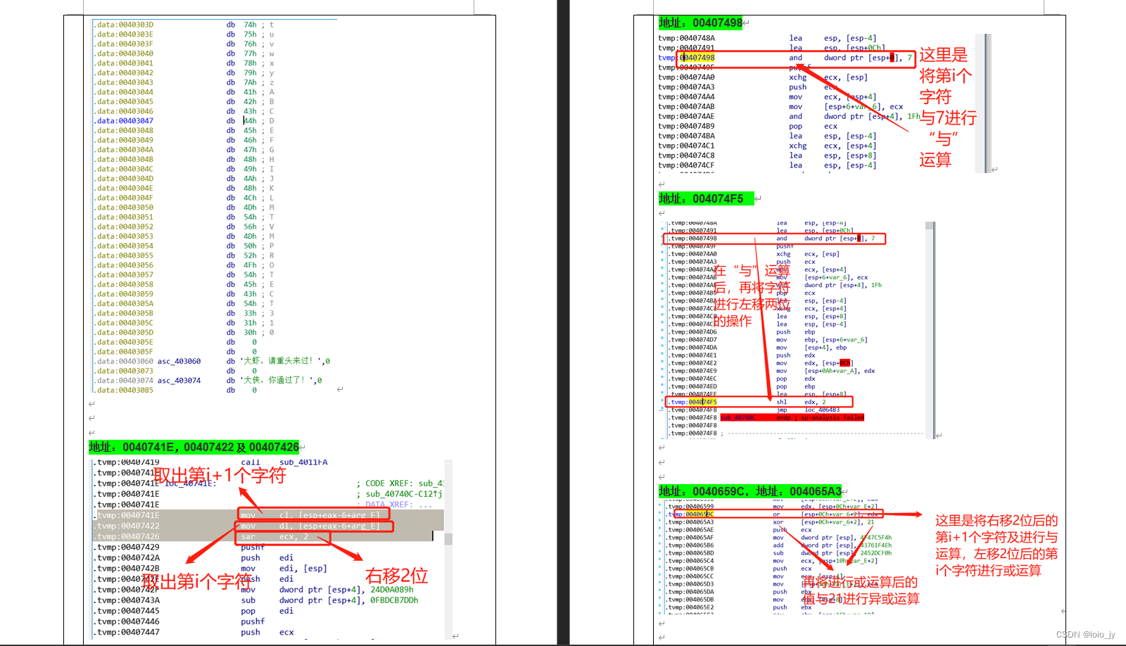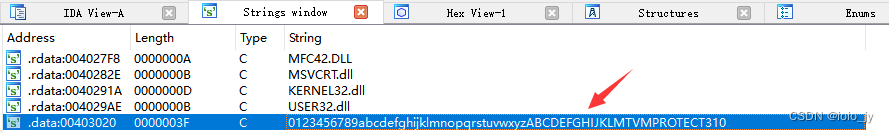 这个时候我就在想,这道题大概率不是这个面试官的原创,应该也是在网上找的,或者即便是这家公司的原创,那么可能之前会有做过的人写过解题思路,那么我能不能搜索一下,看看网上有没有前辈也做过这道题呢?可是我不能直接搜索crackme这个关键字,因为这个字符串太常见了,应当从这个程序内部一些有特色的字符、代码入手。利用IDA的字符分析功能,还真让我找到了一串疑似用于加密的字符: