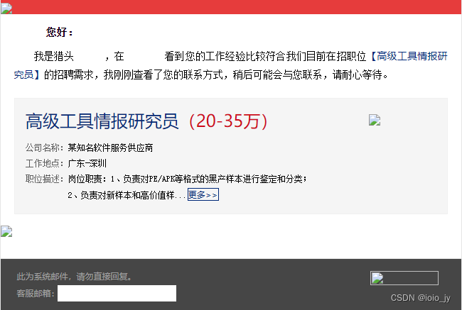 很快,猎头的电话就打过来了。TA和我聊了蛮久,主要是了解一下我的工作经历,我所擅长的技术方向。这里我重点突出了我之前所做的高级研究,也就是启发查杀的情况,这个猎头对于技术多多少少还是懂一些的,因此我们在专业领域的交流上,还是没啥问题的,感觉双方谈得都很尽兴,不过TA却始终没有向我介绍公司的情况。最后,猎头加了我的微信,并且让我写一份最新的简历,让我突出一下启发式查杀的工作经历,也许能够成为我的加分项。于是我就连夜把简历改好,给TA发了过去,但没想到竟然也石沉大海,后来TA就没再联系我,按照我的性格,我也就没有多问,因为当时的我其实还是比较随缘的,也许是对方觉得我的条件也还是不太符合他们的招聘要求,因此就把我给否了吧。而我也觉得没关系,之前积累了丰富的失败经验的我,已经不在乎这一两次的职业机会了。自我安慰道:现在的X高校也不错,收入比较稳定,也还有寒暑假,重点是家也在这里,无需付房租,因此也还是挺好的。后来那个猎头偶尔还会在我的朋友圈里留言,又过了一段时间,我发现TA已经是把我给删掉了,也许是觉得我已经没有了利用价值吧。说到这里我想起来,还是在2018年更早些,也就是4月份的时候,我还收到过一个猎头为某国外银行的中国分行招聘安全工程师的邮件,在要走了我的最新简历之后,连电话都没有打过,便杳无音讯。网上有一种说法,说有的猎头会大量地去获取候选人的简历,至于用来做什么,那就不得而知了。