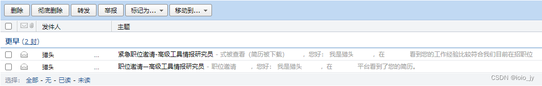 看到这封邮件,给我的第一感觉是,尽管我已经有大半年没登录招聘网站了,但是猎头们依然会上这些网站,估计是采用付费购买的方式来获取候选人的信息,看来我还没有被安全圈子所遗忘,还是有猎头觉得我以前的简历是可以的。第二感觉则是这里面红彤彤的大字——“20-35万”。我目前在X高校属于编外人员的状态,合同内容只有可怜的一页纸,而且还是单面,每月工资的多寡完全取决于我的课时数量,如果能够一直保持第一个学期近乎于爆满的课时数,那么我全年估计能够到手18万左右。而这个猎头直接开出了20万的起步价,因此还是让我很心动的。不过,这个20万应该是税前,按照企业一般的招聘逻辑,尽管薪资是一个区间范围,但基本上也就是会给个最低标准。因此税前的20万,肯定是不如我在X高校的收入多的,但我觉得这个可以谈,也许企业觉得我不错,从而给我了35万的薪水呢。最后,其中的岗位描述也是比较符合我的技术领域,因此整体上我还是比较心动的。唯一不那么好的是,工作地点在深圳,要我离开珠海,我其实还是挺不愿意的,但不管怎么样,我觉得也是可以和猎头谈谈的。而这个猎头估计是怕我没看见这个邮件,尽然还给我发了两遍,最大的区别是第二封邮件加了“紧急”二字,两封邮件的时间间隔为1个小时:
