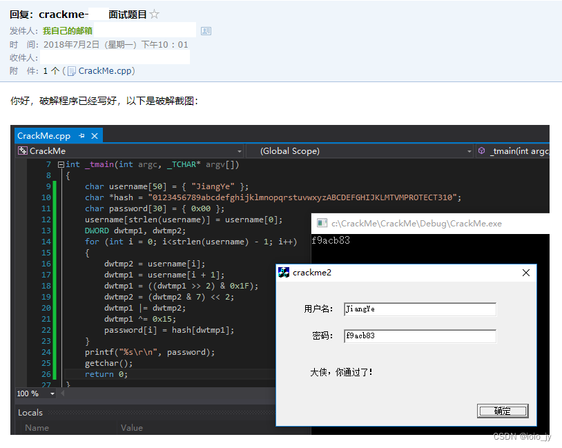 接着我就利用这串字符,再加上一些其它的关键字,果然找到了一位前辈写的解题思路以及注册机代码。我对代码做了一些修改,使其可以在我的Visual C++上运行出来,然后马上给面试官回复了一封邮件,距离TA给我发的邮件仅仅过了2小时11分钟: