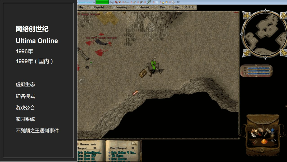1996年(中国 1999年)上线,它是第一款图形网络游戏,在《网络创世纪》之前其实都是文字网游。但它本身并没有逃出文字网游的一些设定,虽然是图形化,但玩家在操作时还是要输入指令,后面出现了宏名指令之后让整个指令过程变得简单一些。