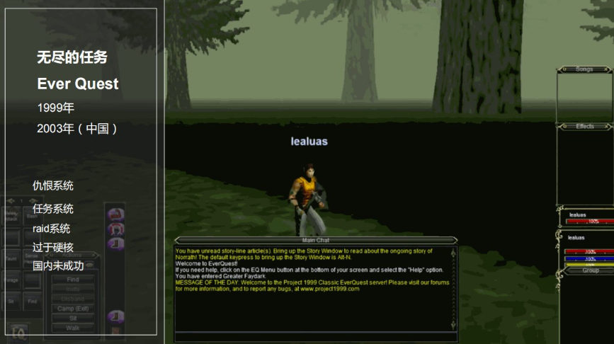 1999年(中国 2003年)上线,简要的概括这款产品就是魔兽世界的前身。当时设计者在网络创世纪看到许多PvP的负面影响,所以定位是主攻PvE,系统非常出彩。比如它首创了仇恨系统,怪物会根据玩家对它不同的攻击来建立一个仇恨的列表,然后优先攻击仇恨列表第一个玩家。它的任务系统也是非常庞大的,给玩家非常多的选择。它也首创了raid系统,即大规模的团队PvE。还有一些职业的分化、buff、debuff、种族天赋都有所体现。