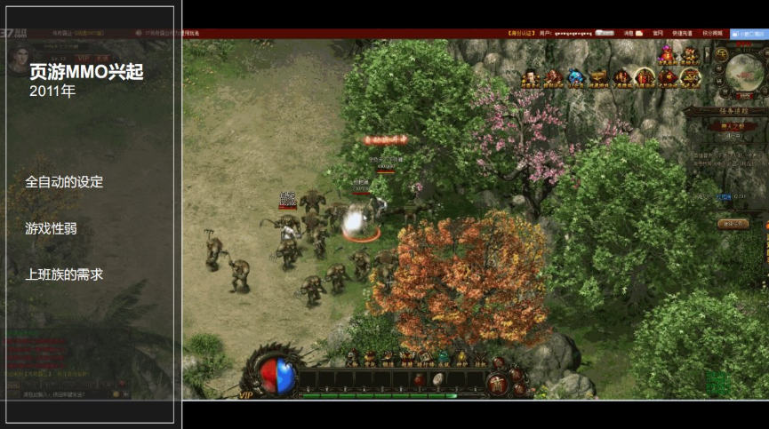 MMO页游的特点就是全自动,它的目标用户就是上班族白领,他们没有时间玩游戏,通过自动挂机的方式来进行任务,打怪升级。在有时间的时候做一些操作比如PK、充值。因为玩法过于简单迅速进入瓶颈期,玩法和品质均无法做到突破。