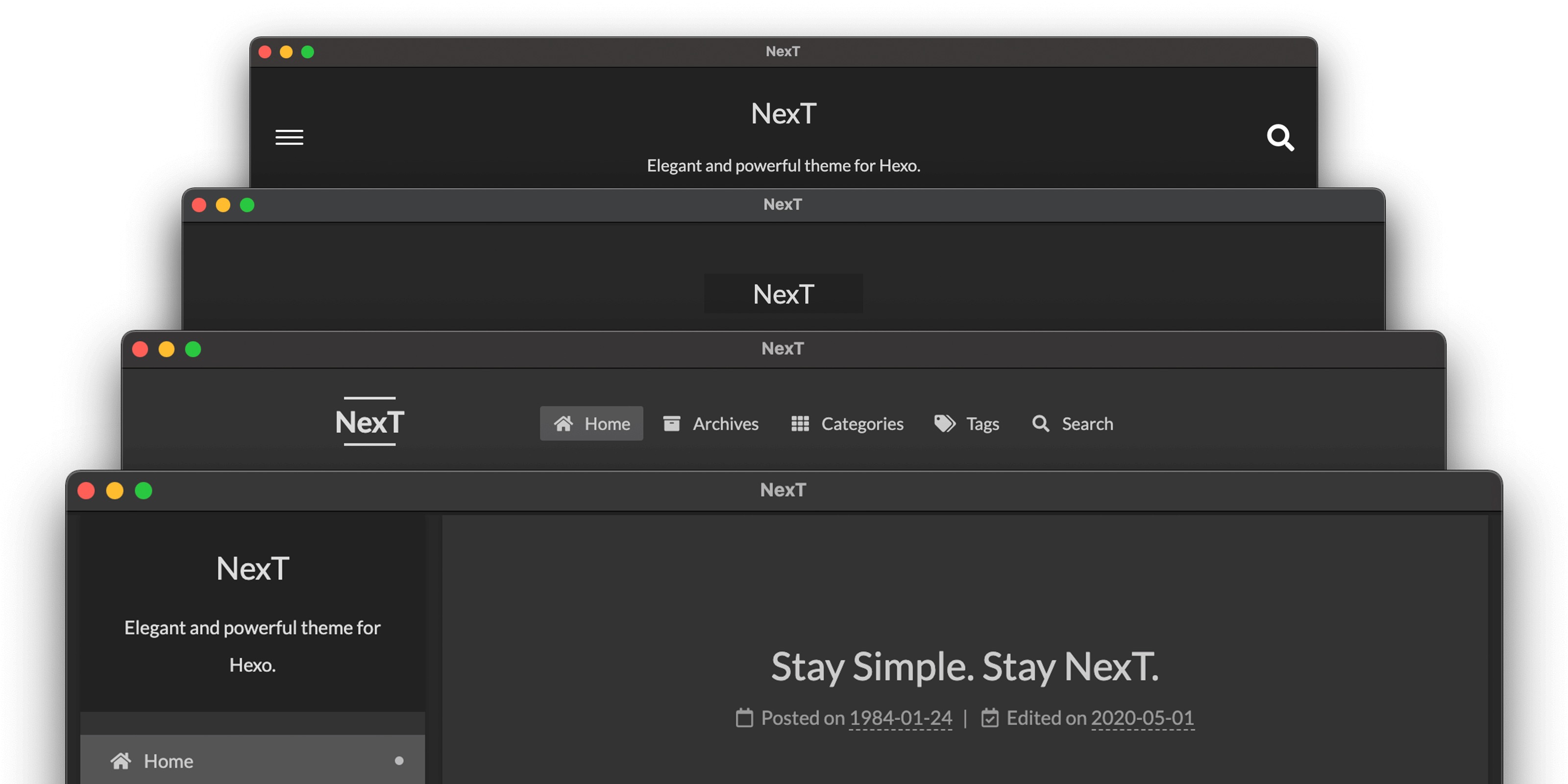 By using different Schemes in NexT, you can simply change the style of your blog, and nearly all options can be used in all schemes.